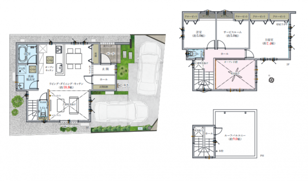 - ルーフバルコニー、システムキッチン、食器洗浄乾燥機、ペット可、駐車場2台分、床下収納、トイレ2箇所、電動シャッター、ガス衣類乾燥機用(幹太くん)ガス栓、シーリングファン、タッチレス水栓